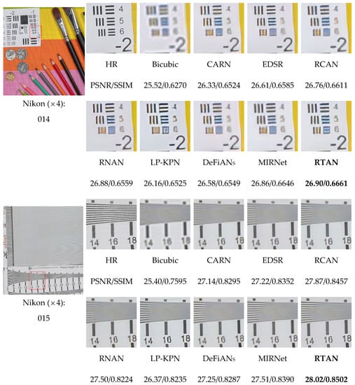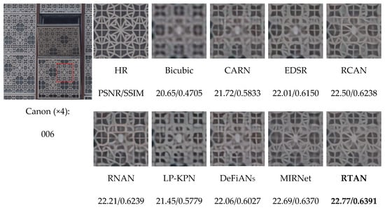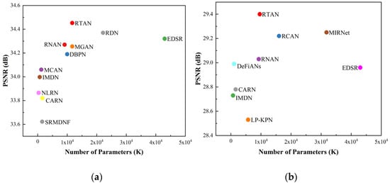 Figure 7a,b show the size of models and SR performance of recent state-of-the-art deep CNN-based SR algorithms under the BI and real-world degradation models, respectively. In order to make comprehensive evaluation, the SR image quality metric is calculated by the average of PSNR on four standard benchmark datasets, i.e., Set5, Set14, B100, Urban100 and two realistic test datasets, i.e., Canon, Nikon, respectively. In Figure 7a, it is obvious that the RTAN outperforms all state-of-the-art models. Especially, the EDSR model which has around 43M parameters has nearly four times more parameters than the proposed RTAN (11.6M). While the PSNR of EDSR is much lower than the proposed RTAN on four benchmark datasets. Similarly, the number of parameters of RTAN is less than RDN (22.1M), but obtains better performance. In addition, the RTAN has similar number of parameters to MGAN (11.7M) but the former achieves much higher PSNR. Considering the importance of practical applications, we further reduce the size of the proposed model for the real-world scenes. As shown in Figure 7b, it not surprising that the CARN and IMDN contain significantly small number of parameters. However, this comes with performance degradation. However, the proposed RTAN has fewer parameters (9.6M) than that of RCAN (16M), MIRNet (31.8M), and EDSR (43M) but achieves much higher PSNR. This implies that the RTAN maintains a better trade-off between model size and performance.
