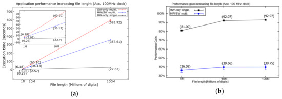 Choosing an input file containing one million digits of π (i.e.,”3” + 1,000,000 digits for asymmetric input), performance results were measured by executing the ‘time’ command or accessing the accelerators’ performance counters. The software-only version spent 6.42 s, 8.13 s, and 1.56 s, on processing the input file (i.e., read, encrypt and upload all digits of π), running the application code in the two available CPU cores and running the Linux OS code, respectively. The mixed hardware and software multitask version spent 3.58 s for processing the input file, with 4.47 s spent in the application and 2.10 s in the Linux OS code. Lastly, the single-task hardware-only version spent 0.30 s to process the input file, with 0.13 s running the application code and 0.14 s executing the Linux OS code.