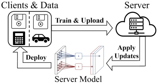 As we become better at using data to enable the use of more complex artificial neural network models, interest in data utilization has attracted the attention of all of society and is starting to be utilized on all devices [1,2]. As various devices begin to participate in training, research is being conducted on how to use a computing model in an environment where computing devices and data are distributed, as opposed to a centralized system with the typical deep learning models [3]. Recently, there has also been a series of active studies on federated learning, which considers privacy more than existing distributed computing models [4,5,6]. What is common between federated learning and the existing distributed computing is that there is a central server and that distributed computing devices are connected to it. The difference is whether or not the central server has the information and control authority of the distributed environment. Federated learning, designed with a widely deployed server model and uncontrollable distributed devices in mind, is in the spotlight because it respects increasing data privacy and allows data to be utilized by assuaging users’ concerns with using their distributed data. A typical implementation of federated learning is shown in Figure 1.