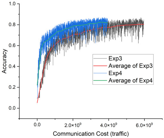 In order to evaluate the effectiveness of the proposed method in federated learning, it is necessary to measure how much communication cost is consumed until the server model has a certain accuracy. At this time, it is necessary to determine how to measure the cost by considering the characteristics of federated learning: that the learning curve is not smooth and fluctuates greatly. There is a gap between when the target performance is first achieved and when it stably converges beyond the target performance. In our experiment, we recorded the communication cost when the server model satisfied the target performance more than three times within five communication times. The target performance measure of the server model is set as the inference accuracy of the server model for the entire dataset. The target performance was set to an accuracy of 0.8, each experiment was repeated four times, and the cost of the four trials was averaged.