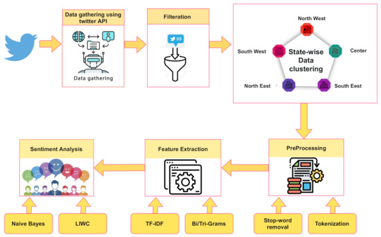 Our proposed method consists of three main steps, which include: data retrieval and pre-processing, feature extraction, and sentiment analysis, as shown in Figure 1. After data were retrieved, they were filtered to remove content not useful in sentiment analysis, such as links, URLs, retweets, usernames, stopwords, and emoticons. The data were clustered into five zones to find region-wise sentiments. After tokenization and pre-processing, features were extracted using term frequency, inverse document frequency (TF-IDF), bigrams, and trigrams. Finally, Naive Bayes was employed to classify sentiments, as explained in the subsequent sections.