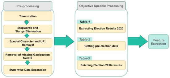 The purpose of the pre-processing module is to perform the filtration process that uses python libraries to retrieve the most important and meaningful parts of the tweets by excluding the unnecessary content. Unprocessed data fetched from any source are usually in raw form and contain several irrelevant attributes, e.g., links, URLs, retweets, usernames, stopwords, emoticons, etc. used in the process of the classification of Twitter data in the context of elections. The tweets are required to be pre-processed accordingly before analysis by removing all the irrelevant attributes from the dataset to avoid any contradiction of the results [48]. Text pre-processing comprises several steps, including data cleansing that includes excluding unrelated data in terms of stop words, slang, URLs, smilies, irrelevant and redundant data. We mainly used five steps to pre-process the data, including tokenization, stopwords, slang elimination, unique character extraction, and URL removal. In particular, we carried out the removal of missing geolocation tweets and lastly, state-wise data separation, as shown in Figure 3.
