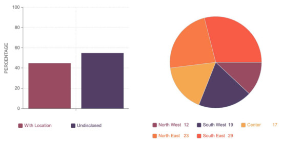 The following section describes the results of the sentiment analysis. Figure 4 shows the breakdown of tweets with and without the location. The tweets were divided into five zones; north west (Idaho, Montana, Oregon, Washington, and Wyoming), South West (Arizona, Colorado, California, Nevada, New Mexico, and Utah), center ( Iowa, Kansas, Minnesota, Missouri, Nebraska, North Dakota, Oklahoma, and Texas), south east (Arkansas, Alabama, Florida, Georgia, Louisiana, Mississippi, North Carolina, South Carolina, and Tennessee) and all remaining states in north east. Figure 4 shows the percentage of tweets collected from these zones. It can be noted that these zones may not precisely resemble the geographic zones but are organized for ease of analysis. Among the remaining 18432811 tweets, only 6614906 lay in the period around elections and were utilized for positive and negative sentiment analysis in Section 4.1. The remaining 11817905 tweets were employed for retrospective analysis in Section 4.2.