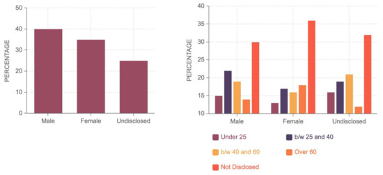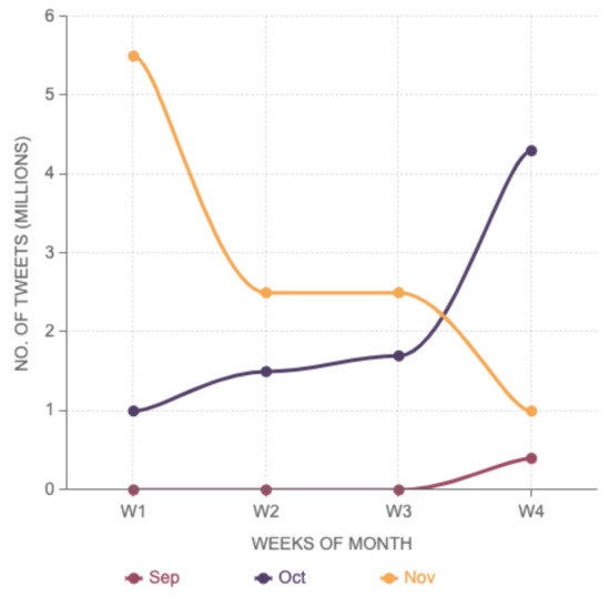 Figure 5 depicts the total number of tweets in different weeks of September, October, and November. It can be noticed that most of the tweets are in the window of mid-October to mid of November. To examine the statistical distribution of data among diverse age and gender groups, Figure 6 provides further insights into data distribution characteristics. It could be observed that the most dominant gender is male with 40%, followed by 35% females. Finally, 25% of the users have either did not disclose their gender or could not be determined directly. It is also interesting to note that most male users are in the age range of 25 and 60. In females, the most dominant users are over 60; however, over-60 users are not very prominent in males. It can also be noted that the female users who do not disclose their age group are higher than males.