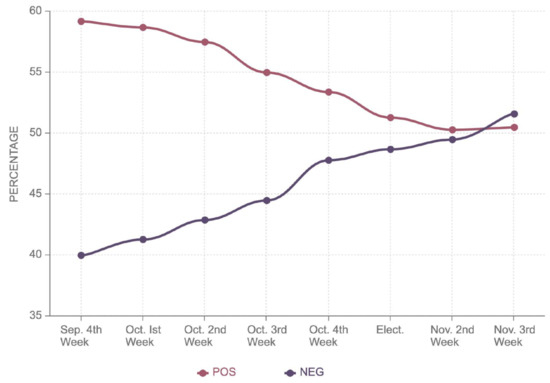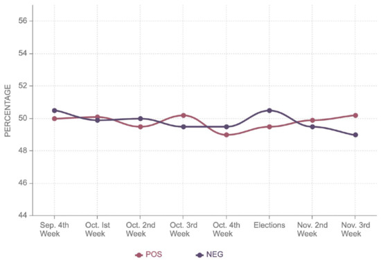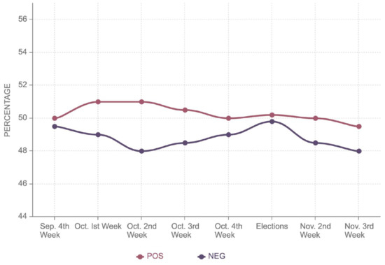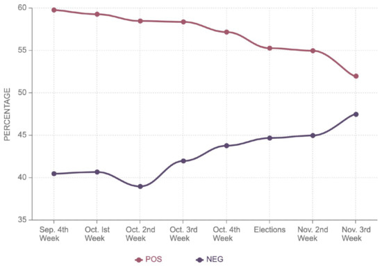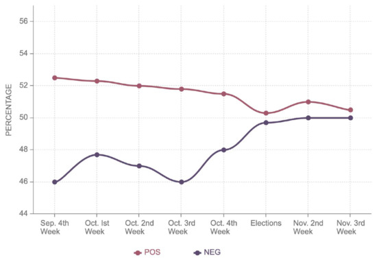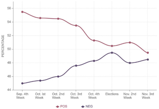 Table 1 in Section 4.1 shows four outlier states; Arizona, Wisconsin, Georgia, and Pennsylvania. In all four states, the election results were different to the sentiments expressed on Twitter. This subsection analyzes the sentiment in further detail by considering an increase or decrease in both positive and negative sentiments weekly between the last week of September to the third week of November 2020. Figure 7 shows a 10% decrease in positive and a 12% increase in negative sentiment. During the elections, it stood as 51.3% positive and 48.7% negative for Donald Trump.