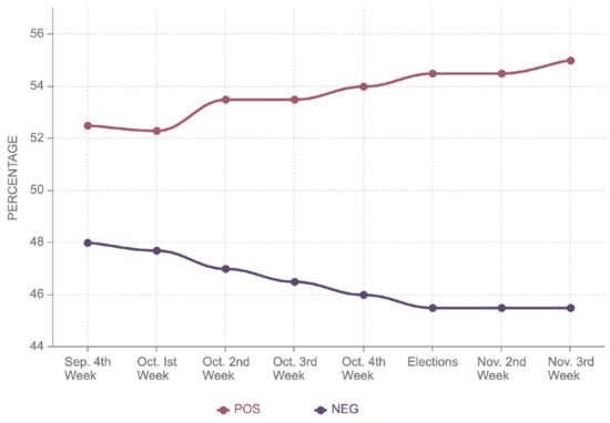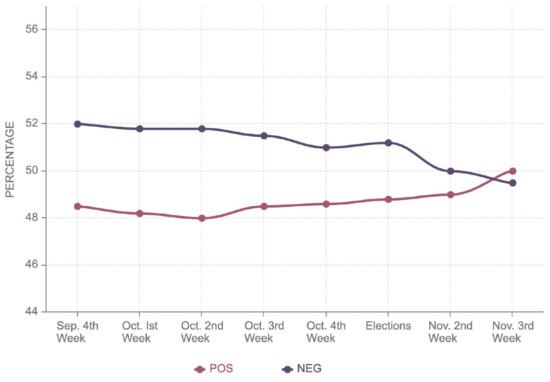 It can be observed that post-election, the negative sentiment further decreased to 52%, surpassing positive sentiment. On the contrary, Figure 8 shows that the negative sentiment for Joe Biden decreased from 49.4% to 49%, while the positive sentiment remained almost around 50%. This explains the marginal victory of Joe Biden with 49.4% as compared to 49.1% by Donald Trump. Joe Biden bagged 49.5% of the electoral votes, securing a narrow victory against Trump, who had 49.3% in Georgia. This state is the outlier considering Donald Trump had more positive sentiment, 55.3%, as opposed to 54.5% for Joe Biden. Similarly, he also had less negative sentiment, 44.7%, as compared to Joe Biden’s 45.5%. It can be noted in Figure 9 that Biden’s negative sentiment in Georgia decreased steadily, reaching 45.5% two weeks after the election; on the other hand, Trump’s negative sentiment grew to 47%, as shown in Figure 10. Likewise, the positive sentiment of Donald Trump declined by 3% following the election, while positive sentiment for Biden improved by 1%. This illustrates the outcome of the election, even though sentiments were different from the election outcomes.