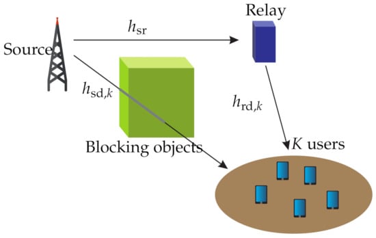 In this scenario, the BS sends the signal to K users in the presence of blockages through the aid of an IRS as depicted in Figure 1. The IRS is equipped with N passive reflecting elements. The signals reflected by each element of the IRS and the signals transmitted by the source can be constructively summed at the destination. Accordingly, the received signal at user k, with is expressed as