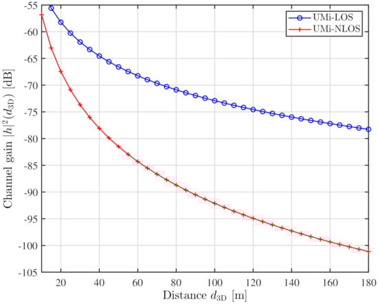 Here, and are the antenna gains for the BS and the user equipment, respectively whereas the value of can be obtained from the Table 1 depending on the propagation model (LoS or NLoS). The gain for this deterministic channel model is depicted in Figure 4 with respect to the distance .