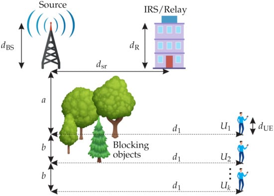 IRS panels/relay nodes are deployed at a fixed distance, from the BS on the top of a building with height . Since there are several blockages between the propagation path of the BS and the UEs as illustrated in Figure 5, there exist only NLoS paths between the BS and UEs. This is the primary use case scenario of deploying IRS or relay, whereby LoS channels can be carved out between the BS and UEs.
