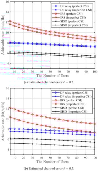 It can be seen from Figure 6a ( for imperfect CSI case) that, under a perfect CSI, the IRS-aided communication achieved the highest rate followed by the DF relay-aided system, which outperformed the basic MU communication without the aid of either of them. Further, as expected, the achievable rate decreased with the increasing number of users for the three scenarios. However, the IRS-aided communication fared better than the rest. In particular, a 250-element IRS could provide higher achievable rates to 100 users than a DF relay or a set-up without either of them. Figure 6b shows similar trends but for . Accordingly, at best, the DF relay with perfect CSI could match the performance of IRS with imperfect CSI when the channel estimation error was high and the number of users was large.