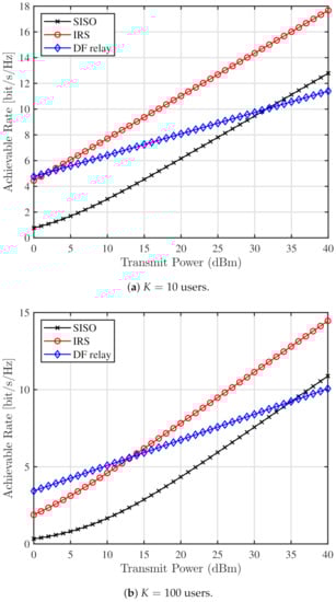 Next, in Figure 7, we study the effect of transmit power for the perfect CSI case on the achievable rate and two different considerations of the total number of users. While, for the case with users, the IRS-aided communication outperformed the rest throughout the entire range of transmit power. For the case of users, a crossing point between the IRS and DF relay can be seen at . Accordingly it can be concluded that the IRS-aided communication outright outperformed the DF relay case when the transmit power was high or the number of users in the network was low.