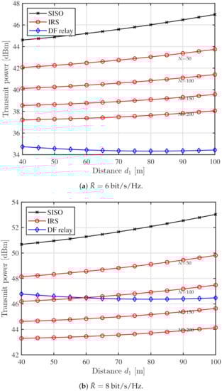 Figure 8 shows the required transmit power with respect to distance for two data rate scenarios bit/s/Hz and bit/s/Hz. Here, the number of users . It can be seen from the figure that, under low data rate requirements ( bit/s/Hz), the DF relay transmitted the least power among the three scenarios. However, when the data rate requirement increased to bit/s/Hz, the IRS- aided frameworks with 150 and 200 elements outperformed the rest. Accordingly, higher QoS requirements can be satisfied in wireless networks by using IRS panels, where the number of elements are greater than 150.