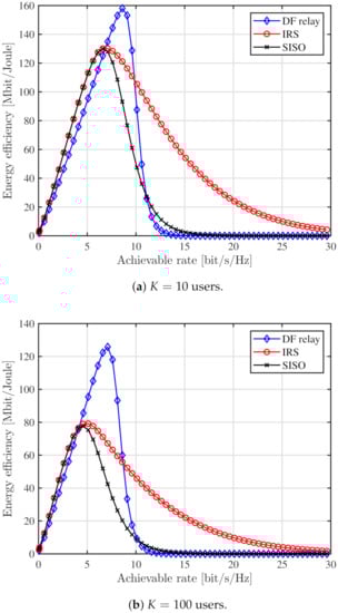 Next, in [14], the authors compared IRS with a DF relay in terms of the rate and energy-efficiency for a single-input single-output (SISO) system. In particular, the authors stated that IRS achieved better energy efficiency compared with the relay for higher rate requirements. Similarly, the authors in [15,16] compared the energy-efficiency performance of an IRS-aided multi-user communication network with that of the AF relaying network. Both works testified that IRS provided more efficient communication than relays.