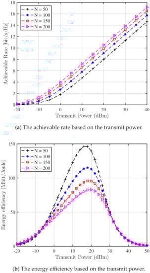 Finally, we study the IRS performance in the case of achievable rate and energy efficiency with respect to the transmit power as shown in Figure 10. In this simulation, we assign the number of users, users, and the power dissipation in each elements of IRS as . We set a different defined number of IRS elements instead of the optimal number of elements that we applied in Figure 9. From Figure 10a, it is known that the achievable rate of IRS will be enhanced as long as the number of IRS elements and the transmit power increase as we obtained based on Equation (). Figure 10b indicates that the IRS with the lowest number of elements attained the highest energy efficiency. The higher number of IRS elements increased the power dissipation in each element as defined in Equation (20), and thus the energy efficiency suffered.