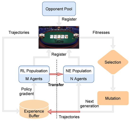 Another approach to deal with this problem is opponent exploitation. Simply put, opponent exploitation is a class of methods that specially design agents to target specific opponents. Sometimes, this approach can achieve greater rewards from the opponents than the equilibrium-based solutions, as it pursues the maximum individual utility against current opponent strategy rather than equalize all possible opponent strategies indiscriminately. Related research for opponent exploitation in NLTH can be seen in several previously published studies [7,8,9,10,11,12], using advanced techniques including deep reinforcement learning, neuroevolution, etc. While methods in these works show practical effectiveness, there still exist some disadvantages that need to be improved. For example, due to the multi-stage sequential decision process and high dimensional action/state space in NLTH, the reinforcement learning (RL) method typically confronts the challenge of sparse rewards that only obtain non-zero values at the final steps [9,10], whereas the neuroevolution (NE) method typically suffers from high sample complexity and struggles to optimize a large number of parameters [11,12]. Generally speaking, these problems can be summed up as ineffective and inefficient learning. For opponent exploitation in a large-scale problem such as NLTH, what we most want to achieve is not merely learning to exploit our opponents as much as possible (effectiveness). We also want to make the learning process as fast as possible (efficiency), which can greatly reduce the consumption of computing resources and time. Thus, developing an effective as well as efficient learning method for opponent exploitation in NLTH is the main motivation of our work.