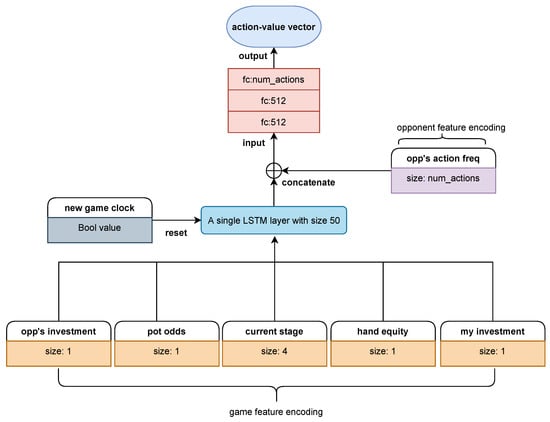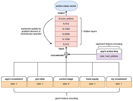 Figure 2 is a prototype architecture mainly designed for early experiments on the combination of the NE and RL methods (henceforth referred to Arc_pro). As seen in Arc_pro, it receives inputs containing two sets of domain-specific features. One (game feature encoding) is made up of detailed information about the current game in which the agent is playing, and the other (opponent feature encoding) is a global vector that tracks the overall performance (simply represented by frequency of actions) of the opponent against which the agent is playing. They are concatenated to form the input tensor and then transferred into hidden layers that consist of fully connected neural networks with the size 512-1024-2048-1024-512. Additionally, the output tensor is mapped to the size of the action space and transformed into an action-value vector. The action space is continuous and infinite in NLTH; however, we observed that it could encourage more exploration by discretizing the actions. This forced the actions to be non-smooth with respect to input observations and parameter perturbations, and thereby encouraged a wide variety of behaviors to be played out. Similar conclusions can be found in Salimans’s work [27]. This architecture is quite straightforward and easily compatible with both the NE and RL methods. It is mainly used to carry out preliminary experiments to verify the feasibility of our method. In the next section we will show the experimental results obtained with Arc_pro to effectively train NLTH agents to exploit weak opponents, such a random agents (RA). Further introductions of game feature encoding rules are as follows: