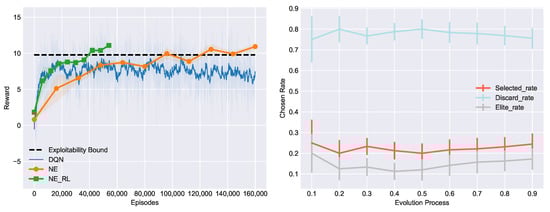 (Left) Comparative performance of NE_RL, NE, and DQN in training against the RA opponent. (Right) Average selection rate of the transferred RL agents changes during the course of evolution and plot with error bars.
