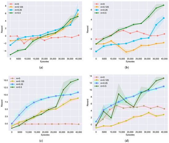 Next, we used an ablation experiment to test how the strength of the transfer process affects NE_RL’s performance. During the transfer process, the RL agents reinsert into the NE population to provide learned gradient information. We define the strength of this process as m, which represents the number of RL agents relative to the size of the NE population. Suppose the size of the NE population is fixed; then, a higher m means a stronger impact imposed on the NE population by the RL agents. Here we represented m as a fraction of the size of the NE population and conducted contrast experiments with different m values. Figure 7 shows the experimental results in training against all four baseline opponents, with m ranging from 0 to 0.5, which means the the strength of the transfer process changes from weak to strong. Typically, represents the original NE method and represents a rather strong NE_RL method, which was commonly used in the previous experiments. From those results, we can conclude that in general, different m values may lead to visible performance differences, which indicates that the value of m may be one of the most important hyper-parameters for NE_RL. In this experiment, it seems that a higher value of m achieved better converging performance after a limited number of 40,000 training episodes. However, this may not be true in all cases. It depends on the specific experimental settings and we cannot draw a definite conclusion in this paper. It may be a good topic to study further in future work.