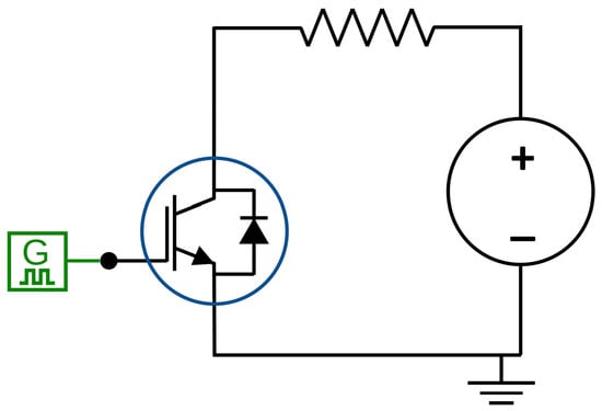 In this paper, three designs for measuring high-power IGBTs’ I–V curves are presented. In the first case (Figure 1), the IGBT can be directly switched via a gate pulse. This schematic is very simple and easy-to-implement, but the rate of current rise during the turn-on process is limited due to the gate resistor; oscillations excited in intrinsic parasitic elements will make it difficult to control the amplitude of the input current pulse [].