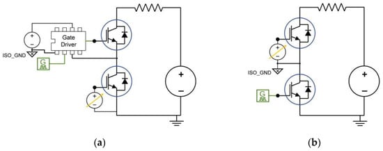 The solution to improve the accuracy and eliminate these fluctuations is to keep the switch always turned on by a constant gate voltage, and on the other hand, the current pulse can be applied on the device under test by the fast switching of another power-switching device connected in series. There are two possible circuits based on the aforesaid method as shown in Figure 2: (1) the device under test is placed at the low side, and (2) the device under test is place at the top of another switch (high side).