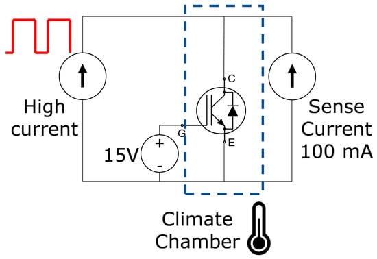 The next step is to establish the power-cycling test setup as depicted in Figure 3. This simple setup will enable us to force a high current on a discrete IGBT. The IGBT’s saturation voltage (VCESat) at low current (100 mA) would be considered as an indicator for estimating the junction temperature (Tj) of the IGBT. The way to extract the linear relationship between VCESat and Tj is provided in []. The voltages and temperatures can be recorded in-situ via a LabView interface during the power cycling for the IGBT under test.