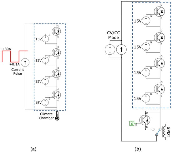The disadvantage of this structure is that to measure the I–V curve, the IGBTs must be taken out of the setup and tested separately. The proposed structure in Figure 4b can solve this problem, as it describes a mixture of the power-cycling test and I–V curve-measurement circuit. A single-pole double-throw relay (SPDT) can take the axillary low side IGBT of the circuit or into the circuit. This auxiliary IGBT can be switched on and off by a short pulse (50 μs) to apply the desired current pulse on the upper switches. In this structure, the collector-emitter voltages should be monitored by an oscilloscope with differential channels (e.g., PicoScope 4444 differential input oscilloscope).