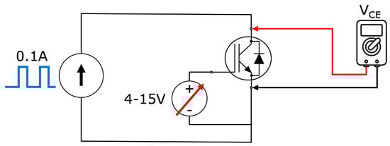 Another measurement that can be done on the IGBTs is to extract the VCE–VGE curve. The knee points at VCE–VGE curve (threshold gate voltage/collector-emitter ON voltage) can also be a suitable failure-precursor parameter to show the IGBT’s health condition (e.g., latch-up) [,,]. When the gate voltage exceeds its threshold, the IGBT acts as an open gate, but it is still not completely turned on until a bias voltage is applied across the collector and emitter. This bias voltage (which is also known as collector-emitter ON voltage) ensures that the carriers reach the emitter from the collector []. Operation at high temperature and high electric field is the main reason for the change in the P-N junction and consequently the gate threshold voltage []. Here, a simple technique is proposed (Figure 5) that can show the effect of both gate threshold and ON threshold voltages. In this case, a current pulse can be applied across the collector-emitter ends. The amplitude of this current pulse is 100 mA in order to prevent self-heating. VGE can be controlled directly by the power supply; VCE can be monitored by an oscilloscope.