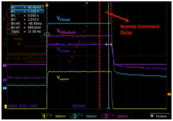 Having the current sensing resistors seemed not to be necessary in this test, as the amplitude of the milli-seconds current pulses could be easily set by the power supply. Since the time interval of these generated current pulses is longer than the self-heating time constant, it was expected that there would be a slight difference in the measurements. An example of this measurement approach is shown in Figure 7. As the command delay was higher than expected, to create a long pulse-measuring case, the power source was switched by a 30-ms long pulse to the gate of the low-side IGBT. To generate the longer current pulses (e.g., >50 ms), the programmable power supply (B&K Precision 9115) can easily supply the desired current determined through the dedicated LabView interface.