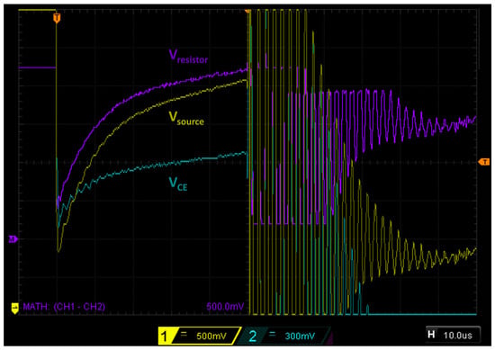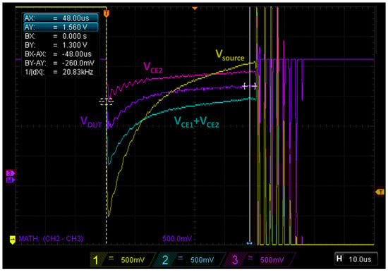 To overcome the aforesaid issue, the second test setup (Figure 2b) was employed so that the DUT was always turned on with a constant gate voltage, and an auxiliary switch was used to generate the high-current pulse across the device under test. A drawback of this method is that it is difficult for the oscilloscope to measure the collector-emitter voltage of the top IGBT as well as the voltage drop across the resistor (which represents the current). For this reason, one alternative is to use an oscilloscope mathematical function instead of a high-bandwidth differential probe, so in this case, two mathematical/subtraction functions are needed: (1) to find the voltage of the resistor and (2) to find the voltage of the device under test. An example of this method is shown in Figure 9. As a validation, at a current of 30 A, the obtained VCE over the DUT is 1.56 V, which is in line with the datasheet (~1.53 V @ 30 A).