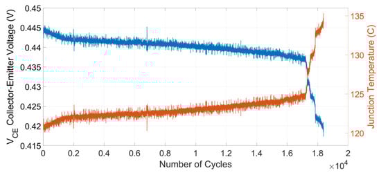 Liu et al. [] examined the effect of degradation on the IGBT’s I-V characteristic curve and transient thermal impedance. A shift of I–V curve and an increase in internal resistance could be seen, but the employed method to extract the I–V curve is not clear in this study. Luo et al. [] modelled the characteristics of an IGBT based on instantaneous on-state resistance (RCE(ON)). In this model, the on-state resistance is a function of the junction temperature (Tj) and collector current (IC). They showed that the RCE(ON) resistance increases by raising the temperature, but the section related to the relation of this resistor to bond-wire failure is incomplete and cursory. A similar study is provided in []. The authors used correlation between VCE and Tj to estimate the instantaneous temperature of the IGBT. Meanwhile, after validation of their simulation by several experimental tests, they investigated the effect of cutting bond wires on the VCE voltage. They found that fracture/cracks in the bond wires would increase this voltage. Jia et al. [] investigated the impact of solder layer degradation on the VCE voltage. They claimed that the solder degradation will cause an increase in operating temperature, which can change the electrical (VCE) and thermal (junction-to-case thermal resistance Rth(j-c)) characterizations of the IGBT over time. Although in this study the effect of solder layer destruction is separated from the bond wires defects, other failure-precursor parameters (e.g., gate threshold voltage and on-state resistance) were not examined.