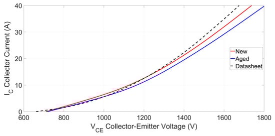 As described in the previous section, the I–V curve was extracted for a healthy IGBT and an aged IGBT after 18,000 thermal cycles, shown in Figure 11.
