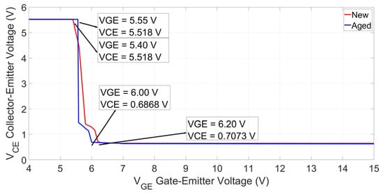 The second curve (VGE–VCE) was extracted as depicted in Figure 12. In this case, the gate voltage was varied in a range of 4 V to 15 V with a step of 0.05 volts, while the collector current was fixed at 100 mA. It can be seen that the knee point in this diagram dropped by 0.2 V to 6.0 V. Additionally, the saturated voltage at 100 mA was reduced from 0.71 V to 0.68 V. The gate-to-emitter threshold voltage (the knee point at the top left) is defined as the minimum bias voltage required to flow current through the collector-emitter. In this experiment, this voltage increased by about 3% (from 5.40 V to 5.55 V). Putting this curve and the previous I–V curve together, it can be concluded that the major degradation was related to the bond wires (as the on-state resistance changed significantly), and the degradation had only a small effect on the inversion layer and gate oxide.