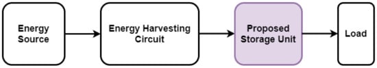 In this work, a novel ultra-low-power integrated storage unit is proposed, suitable for a plethora of energy harvesting autonomous applications (Figure 1). This design is an improved and more versatile version of previous work [18] and presents experimental results. It can be connected to the output of various energy harvesting circuit types (DC-DC converters, charge pumps, etc.) and transfer the harvested energy to the storage media, providing regulated voltage supply to the internal control units of the harvesting circuit and the output loads (e.g., low-power sensors).