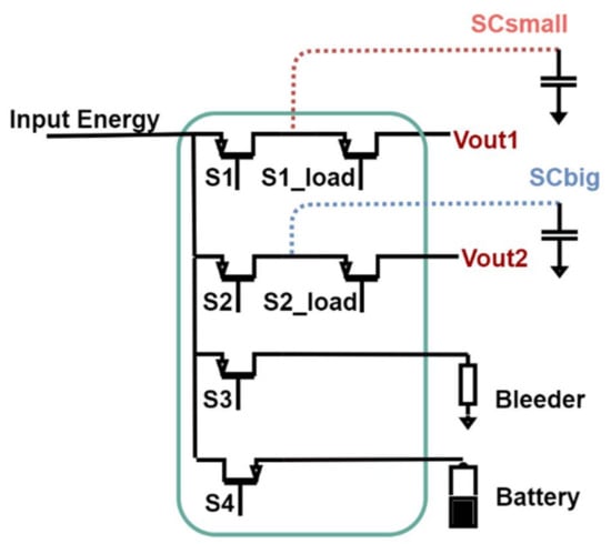 The selection of the supercapacitors values should be based on the needs of each specific application and be decided according to the available input energy and the load’s demands. For instance, if long starvation periods are expected, large supercapacitors should be used, which may increase the required start-up time but will secure the extended survival of the system. Generally, demanding loads that can draw large instant currents during activation (e.g., wide-range RF transmitters) should be connected to SCbig. For SCsmall, a relatively low capacitance is recommended, as it provides fast startup to the system. Finally, for ultra-low-power systems the leakage current of the selected supercapacitors should be considered.