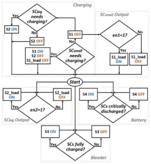 Two additional comparators (comp4 and comp5), monitor VSCsmall and VSCbig voltage levels and activate the battery support if one or both supercapacitors are critically discharged. The S4 switch closes, and the battery provides energy to the supercapacitor in need. The bleeder mode (switch S3) is triggered only in case that both supercapacitors are fully charged.