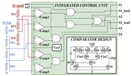 The control circuit of the proposed storage unit, composed of comparators, logic gates and power switches, is depicted in Figure 4. The power switches are implemented with 10,000 um/0.30 um 3.3 V PMOS transistors, which present low on-resistance and sufficient response time. The power switch’s length is set to a minimum in order to present a small layout area. A bulk regulation circuit is added on S1 and S2 switches to prevent supercapacitors from discharging towards the input. To supervise the voltage levels of the storage media, low-power comparators are designed, utilizing resistive MOSFETs and nA bias current (Figure 4). The topology of the used comparator [19] creates a hysteresis window (ΔV) which can be implemented by adjusting the cross-coupled (M5, M6) and diode-connected (M3, M4) transistors aspect ratio as follows: