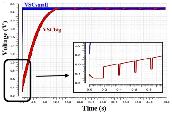 Figure 9 demonstrates the supercapacitors charging mode. Initially, SCsmall begins to charge and only when it is fully charged at the voltage of 2.3 V determined from the thresholds of the comparators, SCbig is connected at the input. As shown, the early-state charging of SCbig stops at about 50 mV, lower than the simulation result, and the overall charging duration is longer. These phenomena are due to the charging path resistance (i.e., chip pins and breadboard PCB resistance), which reduces the charging current. The peak current drawn is 2.1 A in the simulation, while its experimentally measured value is 0.45 A.