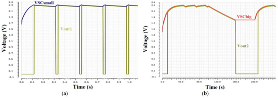 Connection of the external loads according to the predefined voltage thresholds of the supercapacitors. The output loads are disconnected in low-input energy conditions to preserve the operation of the system. (a) SCsmall voltage level and Vout1 load output. (b) SCbig voltage and Vout2 load output.