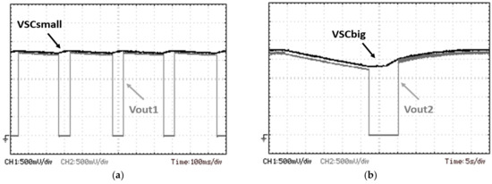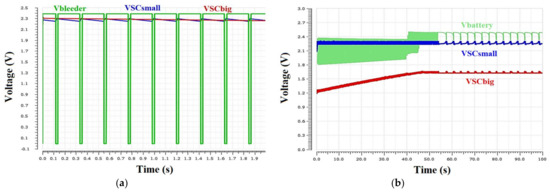The supply of the output loads is depicted in Figure 6a,b. A 100 Ω resistor is connected to Vout1 and a 22 Ω resistor to Vout2, drawing approximately 20 mA and 100 mA, respectively. As shown, the loads are connected when the voltage levels of the supercapacitors exceed the minimum thresholds. Figure 7a presents the activation of the bleeder resistor. Figure 7b shows the battery support mode. The battery input voltage is set to 2.5 V, providing energy to the critically discharged supercapacitors, with the defined charging priority. The SCsmall is recharged to the higher desired voltage (i.e., 2.3 V) to provide proper operation to the internal control circuits, while SCbig voltage is maintained to the minimum threshold (i.e., 1.6 V) to avoid unnecessary usage of the backup battery.