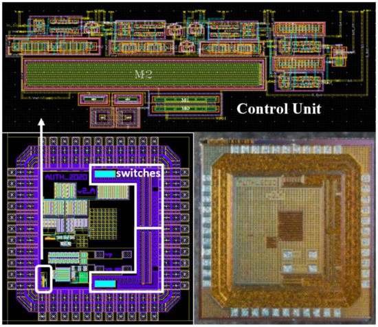 The proposed self-adaptive storage scheme was implemented in a 0.18 um standard CMOS process. The physical design and the chip die are shown in Figure 8. The control unit layout occupies a low die area of 125 um × 50 um.