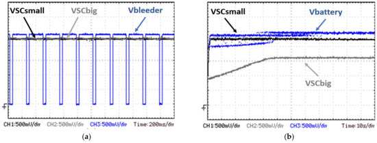 (a) SCsmall voltage (CH1), SCbig voltage (CH2) and bleeder output (CH3) during bleeder mode activation. (b) SCsmall voltage (CH1), SCbig voltage (CH2) and battery input (CH3) during battery energy support.