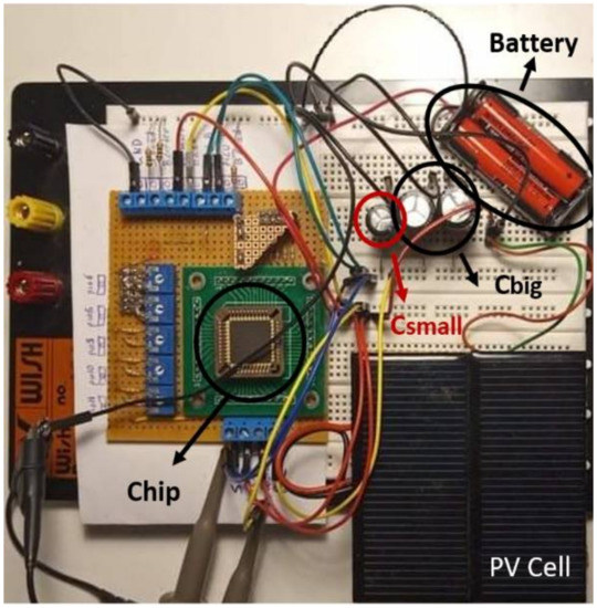 The storage unit was also tested during the energy harvesting operation. A BQ25504 energy harvesting IC combined with an 80 mm × 72 mm PV cell were utilized, harnessing energy at office lighting conditions (approximately 600 Lux of light intensity). The measurement setup is depicted in Figure 12. As this is a low power demanding use case scenario, the values of SCsmall and SCbig were set at 1 mF and 4.4 mF (two 2.2 mF capacitors connected in parallel) respectively.