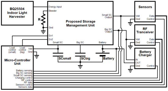 The proposed storage unit is suitable for energy-harvesting-based, wireless sensor node (WSN) applications. The unit can autonomously supervise the charging and discharging of two supercapacitors (SCsmall, SCbig) and a backup battery, exploiting the energy provided by a harvester module. It can be combined with any type of energy harvesting module, such as photovoltaic, triboelectric, piezoelectric, or thermoelectric micro/nano-generators. Depending on the used harvester, a step-up/down converter and/or an AC-DC rectifier might be required (e.g., BQ25504 in case of the small photovoltaic panel or thermoelectric harvester). The proposed storage unit provides two separate power outputs. The SCsmall output, which provides a regulated output voltage (50 mV ripple) has the highest charging priority. Thus, it is considered as the main power output of the unit and should be used for the primary system circuits. Additionally, the SCbig output, provides an unregulated output voltage, however within an adjustable voltage window, with a minimum ΔV of 200 mV. This output has low charging priority and should be used for the secondary circuits of the system. This way extended operation is achieved for the primary system circuits, and additionally, the idle consumption of the secondary ones is eliminated. For embedding an RF transceiver module, an MCU, as well as the required sensors, and in case that real-time acquiring of the sensor data is not mandatory, the SCsmall output can be used for the MCU supply and the sensors supply (for local data logging) and the SCbig output can be used for the power demanding RF transceiver module (so the transmission of the data will take place during energy-rich periods of time).