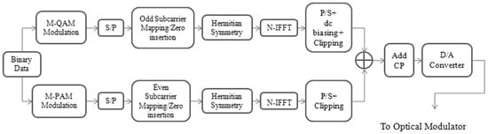 The transmitter block is described in Figure 1, where binary bits of DCO and PAM-DMT are given as input individually. Initially, the binary data for DCO are mapped to a QAM modulator, and the binary data for PAM-DMT are mapped to a PAM-modulator; both are then converted from serial to parallel. The input vector maintains Hermitian symmetry. For this property, and for the unused zeroth (DC) subcarrier, independent data are carried by only N/2-1 out of a total of N subcarriers. Bits of DCO are mapped to odd subcarriers, and it carries N/4 independent data without Hermitian symmetry. Now the input vector of the IFFT block for DCO is as follows.