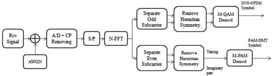On the receiver side, photodetectors convert the incoming optical signal to the electrical domain. The DCO symbols carried by the odd subcarriers are recovered first. After removing Hermitian symmetry, it is demodulated using an M-QAM demodulator. Note that the DCO signal may contain clipping noise, but it can be negligible only by applying an appropriate DC bias. In the same process, PAM-DMT is recovered using an M-PAM demodulator. It can be noted that noise due to clipping in PAM-DMT affects each even subcarrier on its real part. Therefore, it does not have any effect on the signal. Finally, the even parts of imaginary subcarriers are extracted.
