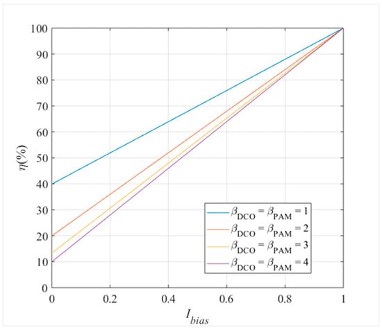 The dimming levels versus bias values are plotted in Figure 3 using (14) with and , following the concept of [5,15]. It illustrates the plots of versus for different scaling factors. It is observed that with the increase in the scaling factor, a wider dimming range can be obtained. It can be shown that a wide dimming range can be obtained for the case of larger values of a scaling factor. Since the level of the average amplitude of the combined signal is higher than the DC bias, with the increment of DC bias, the dimming level increases. The combined signal suffers slightly at low and high dimming levels due to DCO element clipping.