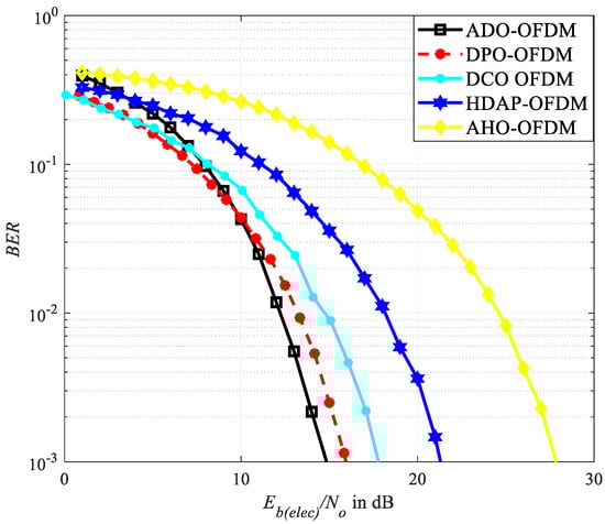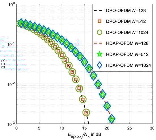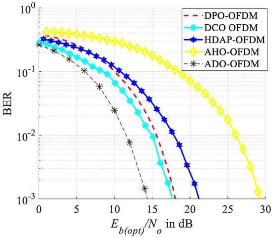 The performance results of DPO and other OFDM schemes are obtained here with the help of simulations with the MATLAB (version 9.2) tool. The simulations were performed for an AWGN channel without considering any other sort of distortion. In order to keep consistency with the results described in the literature [12,22], the target uncoded BER was considered to be 10−3.