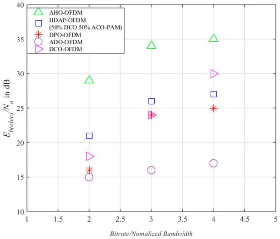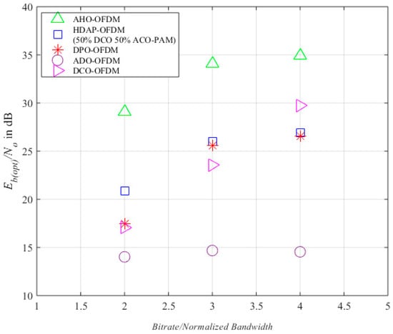 Electrical energy per bit to noise power spectral density () versus bit rate/normalized bandwidth () for hybrid orthogonal frequency division multiplexing (OFDM) considering a bit error rate (BER) of 10−3.