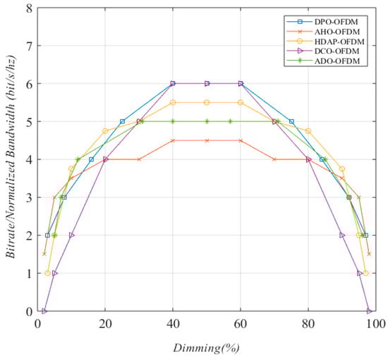 For dimming control of a LiFi transmitter, simulations using MATLAB were performed. For this, the concepts reported in [22,27] were used. Figure 9 shows the performance of the dimming range with respect to R of DPO, HDAP (50% DCO and 50% ACO-PAM), AHO, DCO, and ADO. For dimming flexibility, the size of constellation points is changed so that different plots are obtained. For instance, to attain a 50% dimming, 16-PAM and 4-QAM are used for PAM-DMT and DCO elements, respectively. Note that for the plots, the target BER is considered to be 10−3. The achievable dimming range for DPO is 3–97%, which is similar to HDAP. The dimming range of both AHO and DCO is 2–98%, and that of ADO is 5–96%. For a target dimming value, all OFDM forms will carry the same optical power. This means, at a certain diming level, if the scheme contains better R, it will have better optical power efficiency. Figure 9 shows that for R of 3, the dimming range of DPO is 8–92%, which is close to that of HDAP with a 7–93% dimming range. Moreover, DPO provides better R for dimming range 40–60% compared to other OFDM techniques discussed here.