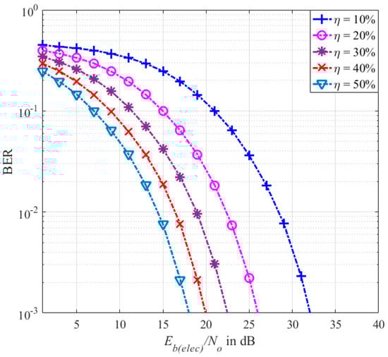 Bit error rate (BER) versus electrical energy per bit to noise power spectral density () for dc-biased pulse amplitude modulated orthogonal frequency division multiplexing (DPO-OFDM) for different dimming levels, .